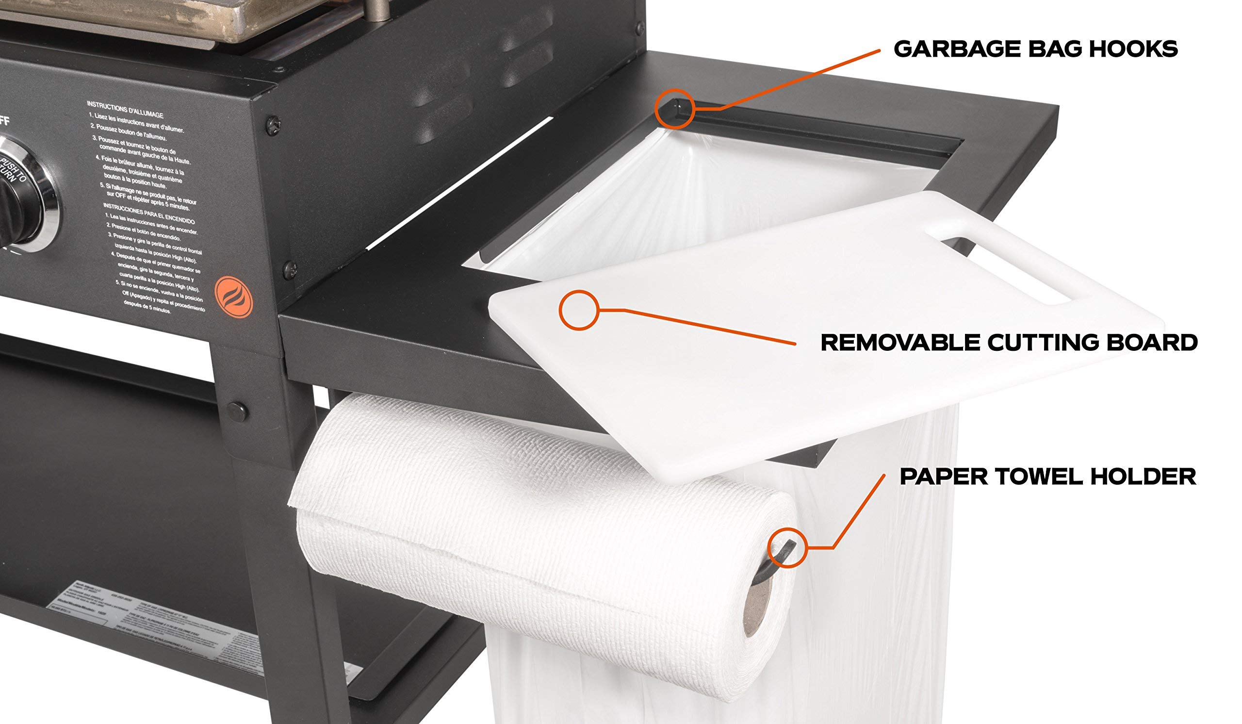 • Blackstone 36" Cooking Station 4 Burner Propane Fuelled Restaurant Grade Professional 36 Inch Outdoor Flat Top Gas Griddle with Built in Cutting Board, Garbage Holder and Side Shelf (1825), Black
