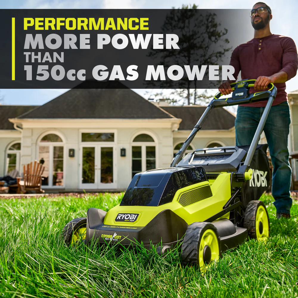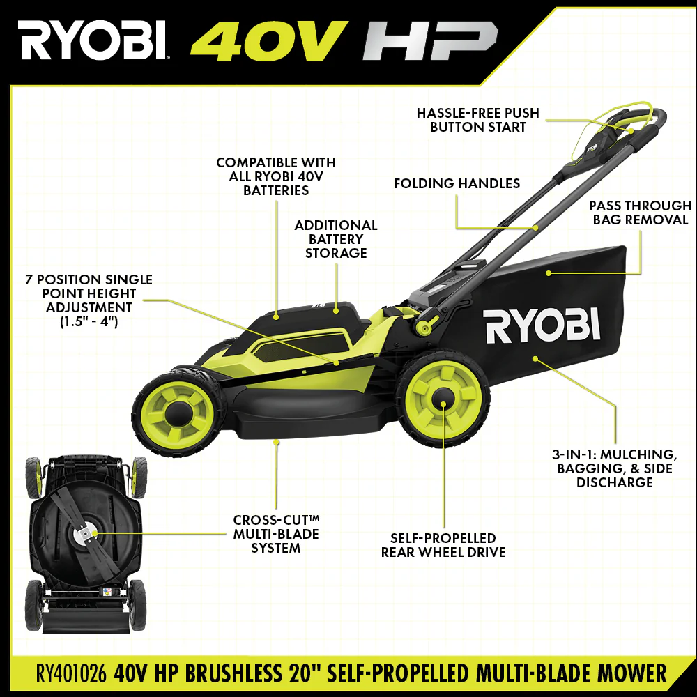 The RYOBI 40V HP Brushless 20″ Self-Propelled Lawn Mower delivers more power than a 150cc gas mower. making it a true gas replacement. Ideal for up to 1/2 acre. this mower comes with an included 40V 6Ah lithium battery for up to 40 minutes of runtime. The brushless motor and advanced electronics automatically react to mowing conditions by increasing the blade speed to eliminate bogging down and powering through the toughest cut. Equipped with self-propelled rear wheel drive. this mower ensures an effortless. efficient mowing experience. For your utmost convenience. adjust the height of your cut with the 7-position single point height adjustment. When you are finished. easily fold the handles and store vertically for compact storage. Best of all. it is part of the RYOBI 40V system where any 40V battery works with any 40V product.